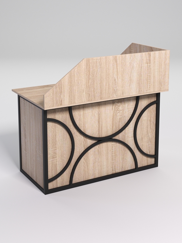 Мебель выполнена в стиле лофт. Фронтальная часть оснащена металлическими декоративными конструкциями, которые составляют оригинальный узор, по внешнему виду напоминающим четыре круга. Стиль лофт подходит для различных стилей интерьера и может быть использована как в коммерческих, так и в жилых помещениях.