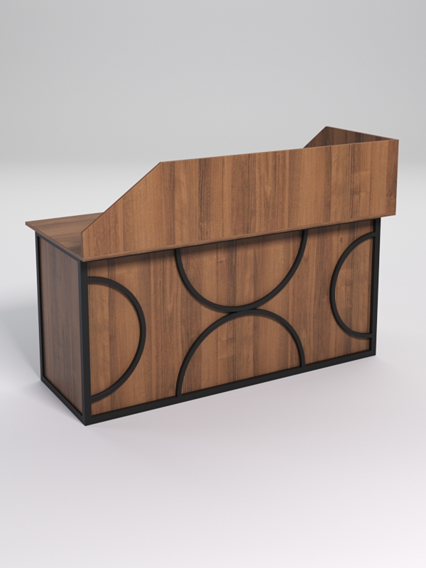 Мебель выполнена в стиле лофт. Фронтальная часть оснащена металлическими декоративными конструкциями, которые составляют оригинальный узор, по внещнему виду напоминающий три круга. Стиль лофт подходит для различных стилей интерьера и может быть использована как в коммерческих, так и в жилых помещениях.