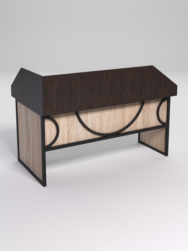 Мебель выполнена в стиле лофт. Фронтальная часть оснащена металлическими декоративными конструкциями, которые составляют оригинальный узор, который напоминает три круга. Стиль лофт подходит для различных стилей интерьера и может быть использована как в коммерческих, так и в жилых помещениях.