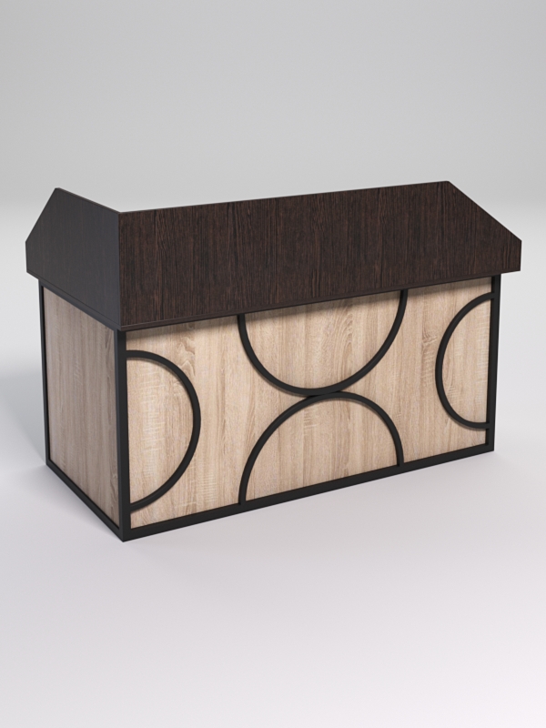 Мебель выполнена в стиле лофт. Фронтальная часть оснащена металлическими декоративными конструкциями, которые составляют оригинальный узор, который по внещнему виду напоминает четыре круга. Стиль лофт подходит для различных стилей интерьера и может быть использована как в коммерческих, так и в жилых помещениях.