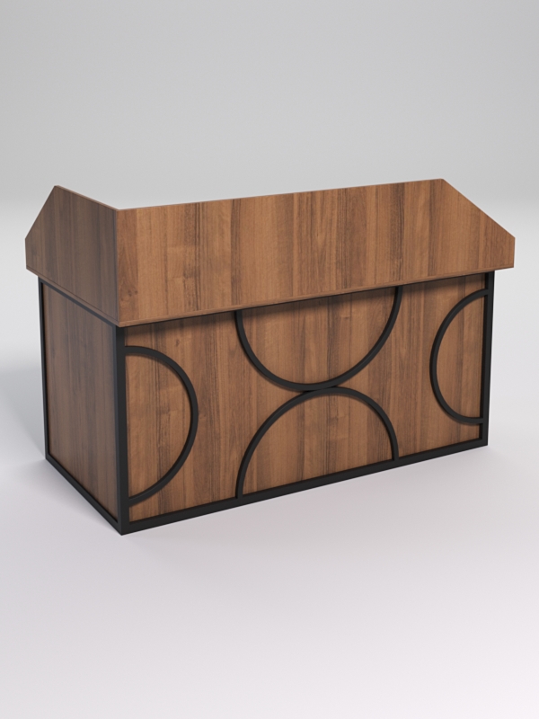 Мебель выполнена в стиле лофт. Фронтальная часть оснащена металлическими декоративными конструкциями, которые составляют оригинальный узор, который по внещнему виду напоминает четыре круга. Стиль лофт подходит для различных стилей интерьера и может быть использована как в коммерческих, так и в жилых помещениях.