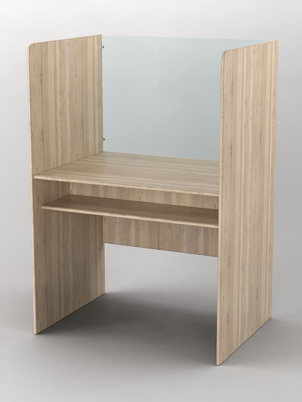 Парта для лингафонного кабинета. Особенностью лингафонной кабинки является шумоизолирующая перегородка, которая помогает при изучении иностранных языков в различных учебных заведениях. Под столешницей имеется полка, где можно хранить наушники или иную технику для обучения. Материал — столешница, полка, левая и правая перегородка выполнены из лдсп, передняя часть стеклянная. Переднюю часть можно выполнить из оргстекла, но итоговая стоимость будет больше, поэтому цену уточняйте у менеджера.