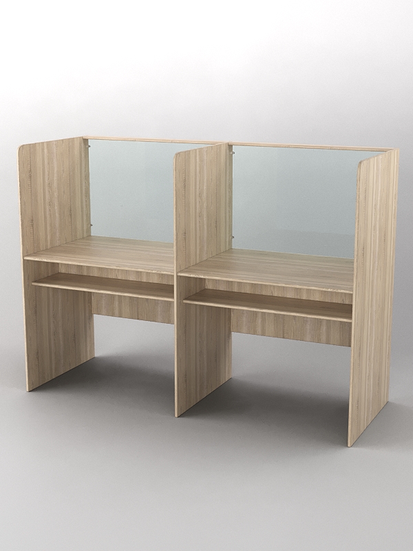 Парта для лингафонного кабинета. Модель сдвоенная. Особенностью лингафонной кабинки является шумоизолирующая перегородка, которая помогает при изучении иностранных языков в различных учебных заведениях. Под столешницей имеется полка, где можно хранить наушники или иную технику для обучения. Материал — столешница, полка, левая и правая перегородка выполнены из лдсп, передняя часть стеклянная. Переднюю часть можно выполнить из оргстекла, но итоговая стоимость будет больше, поэтому цену уточняйте у менеджера.
