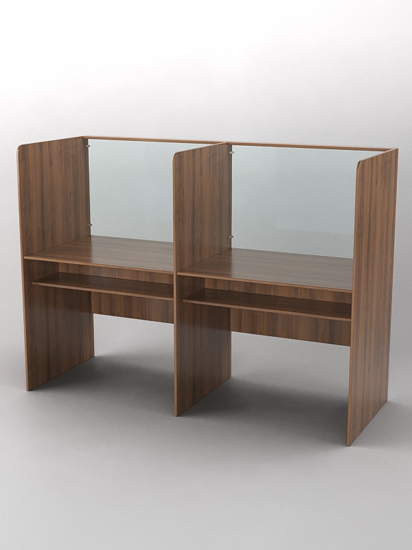 Парта для лингафонного кабинета. Модель сдвоенная. Особенностью лингафонной кабинки является шумоизолирующая перегородка, которая помогает при изучении иностранных языков в различных учебных заведениях. Под столешницей имеется полка, где можно хранить наушники или иную технику для обучения. Материал — столешница, полка, левая и правая перегородка выполнены из лдсп, передняя часть стеклянная. Переднюю часть можно выполнить из оргстекла, но итоговая стоимость будет больше, поэтому цену уточняйте у менеджера.