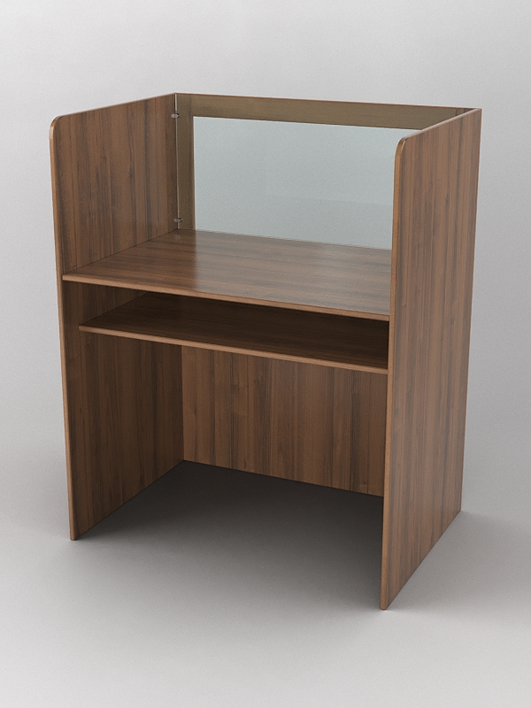 Парта для лингафонного кабинета. Особенностью лингафонной кабинки является шумоизолирующая перегородка, которая помогает при изучении иностранных языков в различных учебных заведениях. Под столешницей имеется полка, где можно хранить наушники или иную технику для обучения. Материал — столешница, полка, левая и правая перегородка выполнены из лдсп, передняя часть стеклянная. Переднюю часть можно выполнить из оргстекла, но итоговая стоимость будет больше, поэтому цену уточняйте у менеджера.