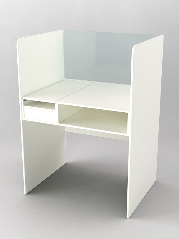 Парта для лингафонного кабинета. Конструкция стола позволяет установить пульт с кнопкой вызова преподавателя, регулятор громкости и разъем для гарнитуры. Гарнитуру можно открыть и закрыть при помощи крышки. Также под столешницей имеется полка, где можно хранить различное оборудование для обучения. Материал — столешница, полка, левая и правая перегородка выполнены из лдсп, передняя часть стеклянная. Переднюю часть можно установить из оргстекла, но итоговая стоимость будет больше, поэтому цену уточняйте у менеджера.