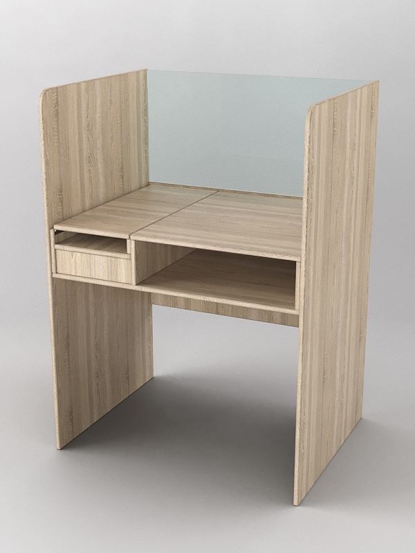 Парта для лингафонного кабинета. Конструкция стола позволяет установить пульт с кнопкой вызова преподавателя, регулятор громкости и разъем для гарнитуры. Гарнитуру можно открыть и закрыть при помощи крышки. Также под столешницей имеется полка, где можно хранить различное оборудование для обучения. Материал — столешница, полка, левая и правая перегородка выполнены из лдсп, передняя часть стеклянная. Переднюю часть можно установить из оргстекла, но итоговая стоимость будет больше, поэтому цену уточняйте у менеджера.