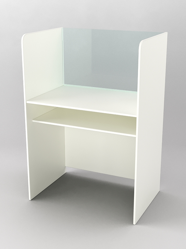 Парта для лингафонного кабинета. Особенностью лингафонной кабинки является шумоизолирующая перегородка, которая помогает при изучении иностранных языков в различных учебных заведениях. Под столешницей имеется полка, где можно хранить различное оборудование для обучения. Столешница, полка, левая и правая перегородка выполнены из лдсп, передняя часть стеклянная. Переднюю часть можно выполнить из оргстекла, но итоговая стоимость будет больше, поэтому цену уточняйте у менеджера.