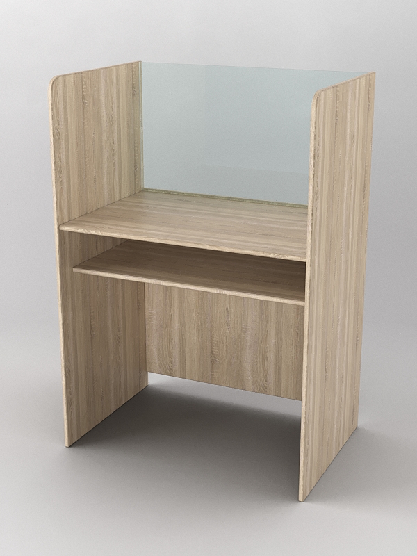 Парта для лингафонного кабинета. Особенностью лингафонной кабинки является шумоизолирующая перегородка, которая помогает при изучении иностранных языков в различных учебных заведениях. Под столешницей имеется полка, где можно хранить различное оборудование для обучения. Столешница, полка, левая и правая перегородка выполнены из лдсп, передняя часть стеклянная. Переднюю часть можно выполнить из оргстекла, но итоговая стоимость будет больше, поэтому цену уточняйте у менеджера.