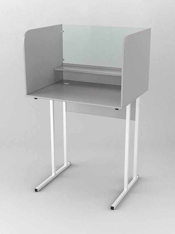 Парта для лингафонного кабинета. Особенностью лингафонной кабинки является шумоизолирующая перегородка, которая помогает при изучении иностранных языков в различных учебных заведениях. Столешница, полка, левая и правая перегородка выполнены из лдсп, передняя часть стеклянная. Переднюю часть можно выполнить из оргстекла, но итоговая стоимость будет больше, поэтому цену уточняйте у менеджера. Ножки металлические с крючком для наушников. На столешнице имеется небольшое отверстие для клавиатуры или иной техники.