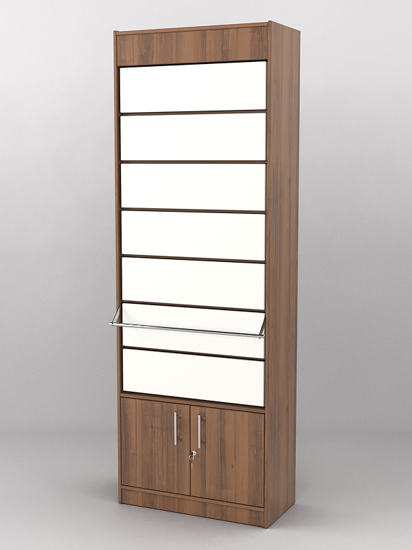 Табачный шкаф с семью гравитационными полками. Все створки поднимаются синхронно при помощи ручки, благодаря чему увеличивается скорость обслуживания клиентов. Закрыть или открыть полки можно без труда. Внизу имеется вместительный накопитель с раздвижными фасадами, там удобно размещать запасы сигарет. Размер сигарет по высоте до 100мм.