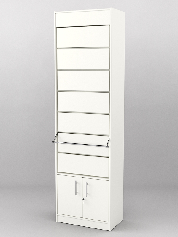 Табачный шкаф с семью гравитационными полками. Все створки поднимаются синхронно при помощи ручки. Закрыть или открыть полки можно без труда. Внизу имеется вместительный накопитель с раздвижными фасадами, там удобно размещать запасы сигарет. Размер сигарет по высоте до 100мм.