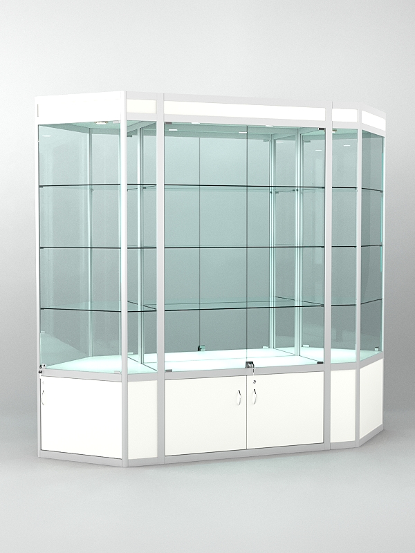 Витрина для кубков и наград. В основной части стенда установлено три стеклянные полки. Комплектуется сверху светодиодной подсветкой. Каркас алюминиевый. Данная выставочная мебель предназначена для хранения и демонстрации наград, как дома, так и в общественных учреждениях и компаниях. Задняя стенка стеклянная. В нижней части имеется накопитель с дверцами.