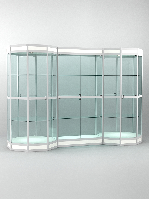 Витрина для кубков и наград. В основной части стенда установлено три стеклянные полки. Комплектуется сверху светодиодной подсветкой. Каркас алюминиевый. Задняя стенка стеклянная.
