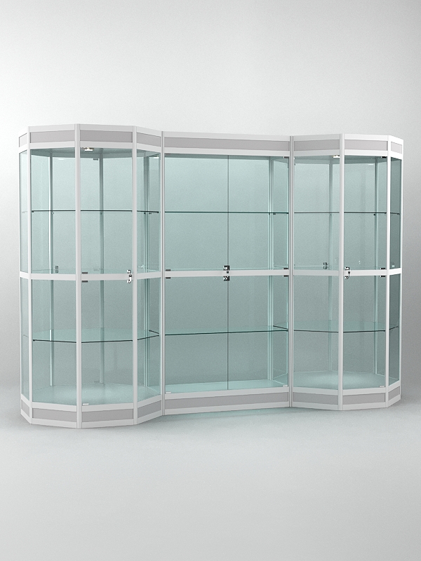 Витрина для кубков и наград. В основной части стенда установлено три стеклянные полки. Комплектуется сверху светодиодной подсветкой. Каркас алюминиевый. Задняя стенка стеклянная.