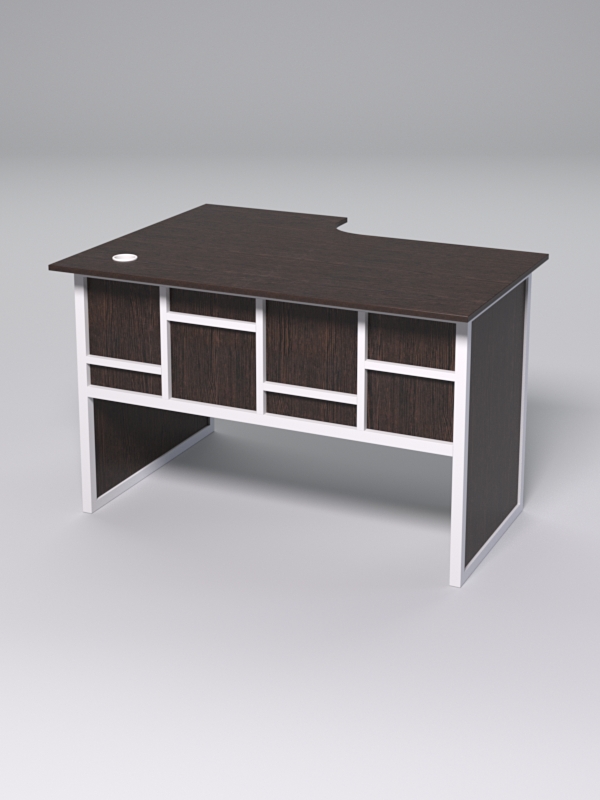 Стол состоит из 4х деталей, которые скрепляются между собой конфирматами и мебельными уголками. Столешница имеет фигурный вырез со стороны работника. Инструкция по сборке не требуется.