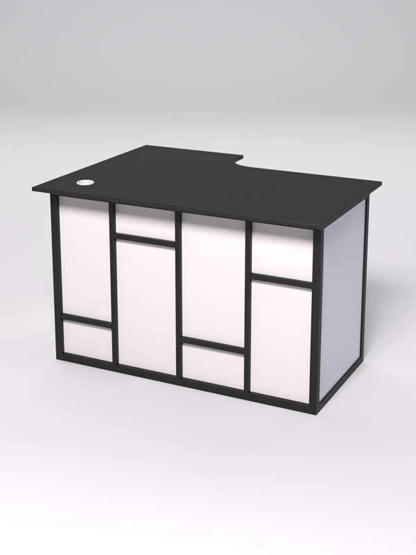 Стол состоит из 4х деталей, которые скрепляются между собой конфирматами и мебельными уголками. Столешница имеет фигурный вырез со стороны работника. Инструкция по сборке не требуется.
