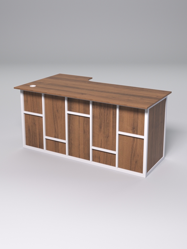 Стол состоит из 4х деталей, которые скрепляются между собой конфирматами и мебельными уголками. Столешница имеет фигурный вырез со стороны работника. Инструкция по сборке не требуется.