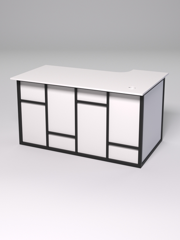 Стол состоит из 4х деталей, которые скрепляются между собой конфирматами и мебельными уголками. Столешница имеет фигурный вырез со стороны работника. Инструкция по сборке не требуется.