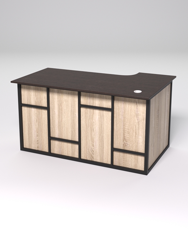Стол состоит из 4х деталей, которые скрепляются между собой конфирматами и мебельными уголками. Столешница имеет фигурный вырез со стороны работника. Инструкция по сборке не требуется.