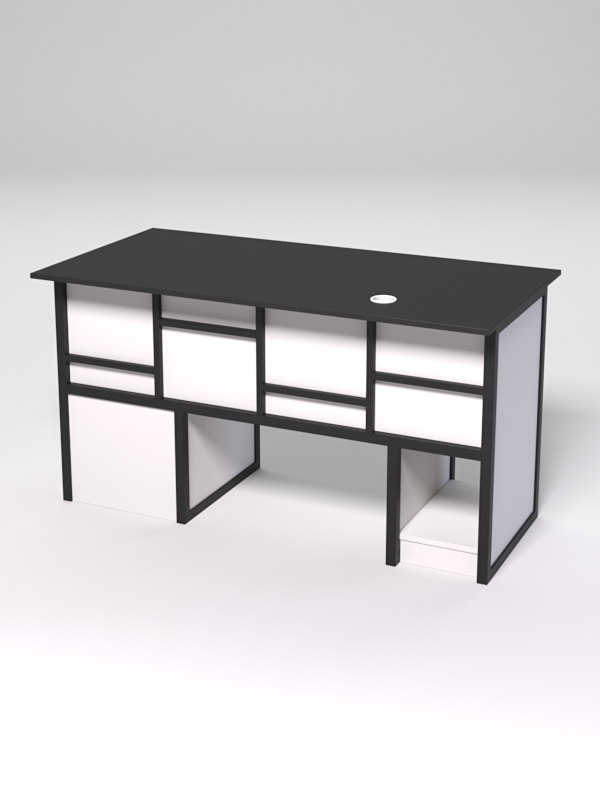В столе с левой стороны предусмотрено место для системного блока, справа расположена тумба с 3мя выдвижными ящиками для документов. Нижняя столешница выдвижная, направляющие — шариковые. Инструкция по сборке не требуется.