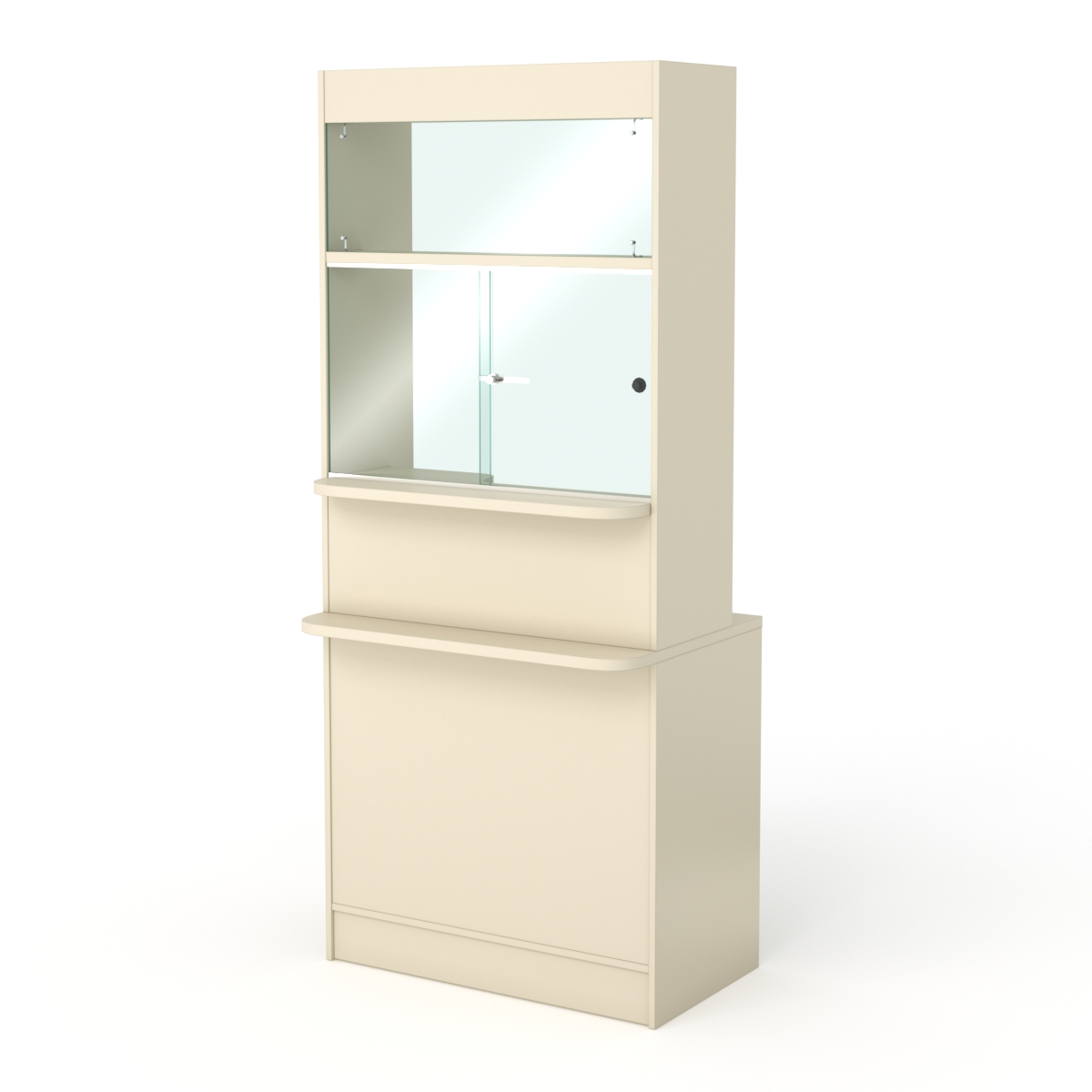 Прилавок имеет закрытый фасад с двумя полками, стеклянные дверцы на уровне глаз покупателя и стеклянное окошко чуть выше. Со стороны продавца прилавок открыт. Внутри модели имеется две полки под демонстрируемый товар, столешница, выдвижной ящик, просторная ниша и две полки.
