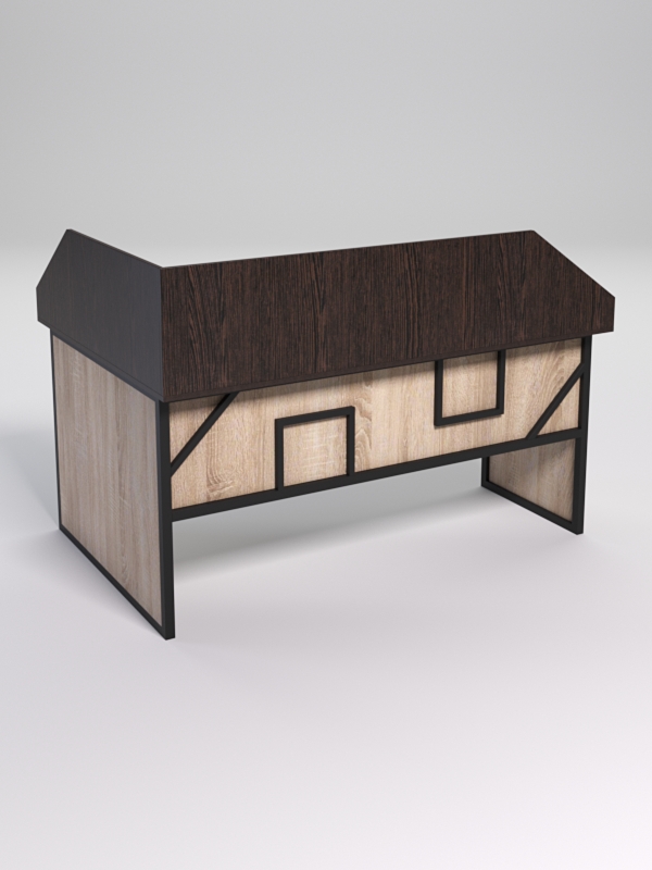Мебель выполнена в стиле лофт с оригинальными узорами, которые похожи на два квадрата и два треугольника. Стиль лофт подходит для различных стилей интерьера и может быть использована как в коммерческих, так и в жилых помещениях. Столешница стола также имеет необычную волнообразную форму.