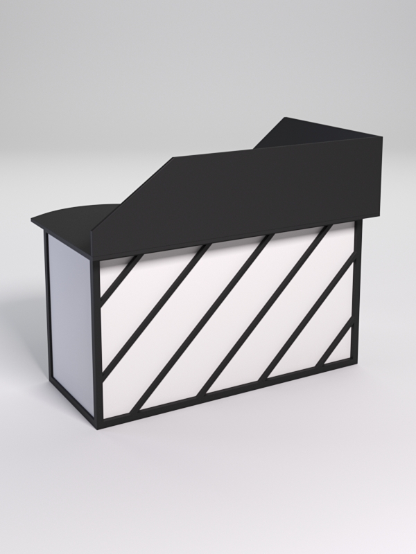 Мебель выполнена в стиле лофт. Фронтальная часть оснащена металлическими декоративными конструкциями, которые напоминают дигональные линии. Стиль лофт подходит для различных стилей интерьера и может быть использована как в коммерческих, так и в жилых помещениях. Столешница стола также имеет необычную волнообразную форму.