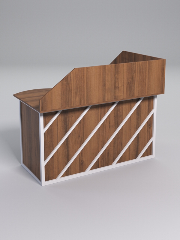 Мебель выполнена в стиле лофт. Фронтальная часть оснащена металлическими декоративными конструкциями, которые напоминают дигональные линии. Стиль лофт подходит для различных стилей интерьера и может быть использована как в коммерческих, так и в жилых помещениях. Столешница стола также имеет необычную волнообразную форму.