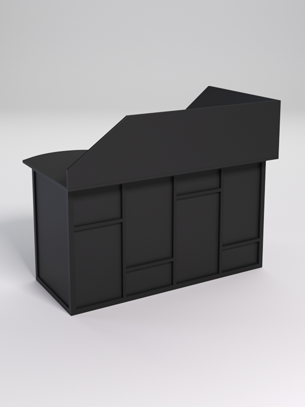 Мебель выполнена в стиле лофт. Фронтальная часть оснащена металлическими декоративными конструкциями, с оригинальным дизайном. Стиль лофт подходит для различных стилей интерьера и может быть использована как в коммерческих, так и в жилых помещениях. Столешница стола также имеет необычную волнообразную форму.