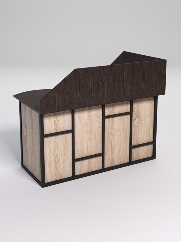 Мебель выполнена в стиле лофт. Фронтальная часть оснащена металлическими декоративными конструкциями, с оригинальным дизайном. Стиль лофт подходит для различных стилей интерьера и может быть использована как в коммерческих, так и в жилых помещениях. Столешница стола также имеет необычную волнообразную форму.
