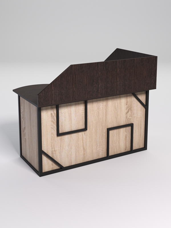 Мебель выполнена в стиле лофт. Фронтальная часть оснащена металлическими декоративными конструкциями, с оригинальным дизайном, которые напоминают два треугольника и два квадрата. Стиль лофт подходит для различных стилей интерьера и может быть использована как в коммерческих, так и в жилых помещениях. Столешница стола также имеет необычную волнообразную форму.