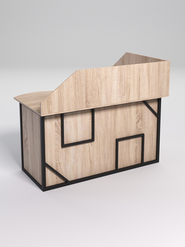Мебель выполнена в стиле лофт. Фронтальная часть оснащена металлическими декоративными конструкциями, с оригинальным дизайном, которые напоминают два треугольника и два квадрата. Стиль лофт подходит для различных стилей интерьера и может быть использована как в коммерческих, так и в жилых помещениях. Столешница стола также имеет необычную волнообразную форму.
