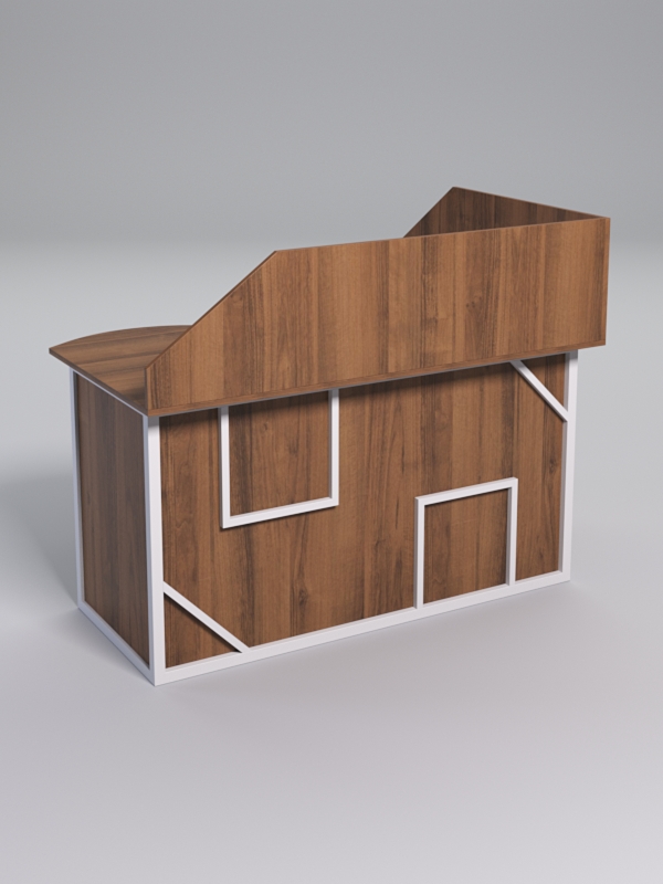 Мебель выполнена в стиле лофт. Фронтальная часть оснащена металлическими декоративными конструкциями, с оригинальным дизайном, которые напоминают два треугольника и два квадрата. Стиль лофт подходит для различных стилей интерьера и может быть использована как в коммерческих, так и в жилых помещениях. Столешница стола также имеет необычную волнообразную форму.