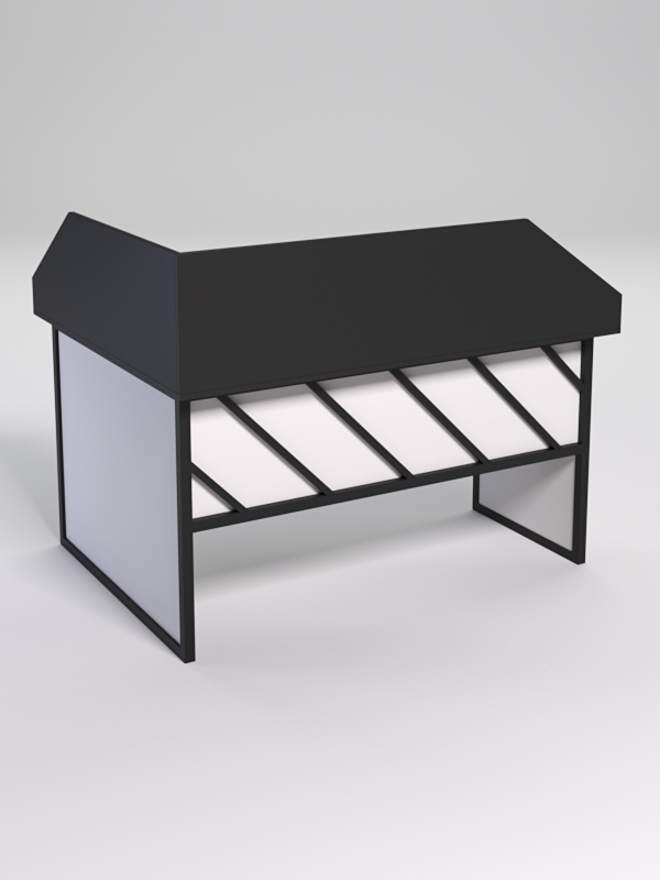 Мебель выполнена в стиле лофт. Фронтальная часть оснащена металлическими декоративными конструкциями, с оригинальным дизайном, которые похожи на дигональные линии. Стиль лофт подходит для различных стилей интерьера и может быть использована как в коммерческих, так и в жилых помещениях. Столешница стола также имеет необычную волнообразную форму.