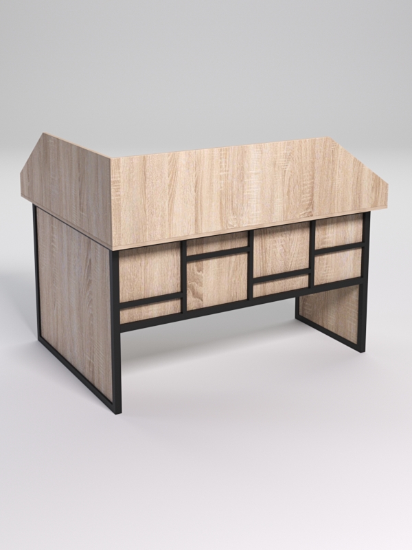 Мебель выполнена в стиле лофт. Фронтальная часть оснащена металлическими декоративными конструкциями, с оригинальным дизайном. Стиль лофт подходит для различных стилей интерьера и может быть использована как в коммерческих, так и в жилых помещениях. Столешница стола также имеет необычную волнообразную форму.