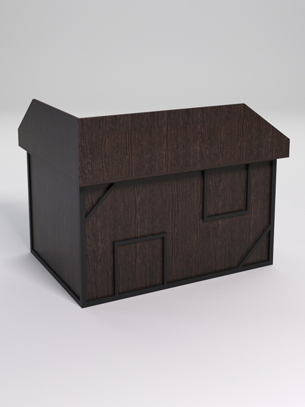 Мебель выполнена в стиле лофт. Фронтальная часть оснащена металлическими декоративными конструкциями, два квадрата и два треугольника. Стиль лофт подходит для различных стилей интерьера и может быть использована как в коммерческих, так и в жилых помещениях. Столешница стола также имеет необычную волнообразную форму. У данной конструкции расположена царга до пола.