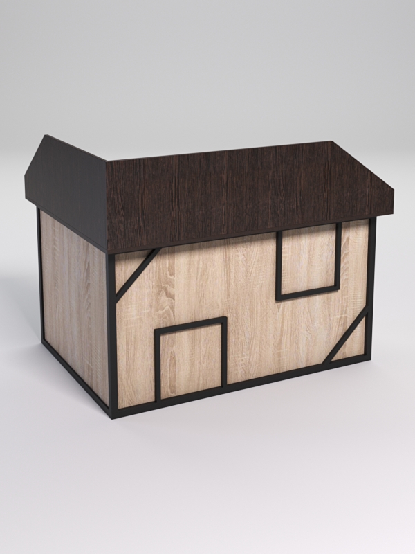 Мебель выполнена в стиле лофт. Фронтальная часть оснащена металлическими декоративными конструкциями, два квадрата и два треугольника. Стиль лофт подходит для различных стилей интерьера и может быть использована как в коммерческих, так и в жилых помещениях. Столешница стола также имеет необычную волнообразную форму. У данной конструкции расположена царга до пола.