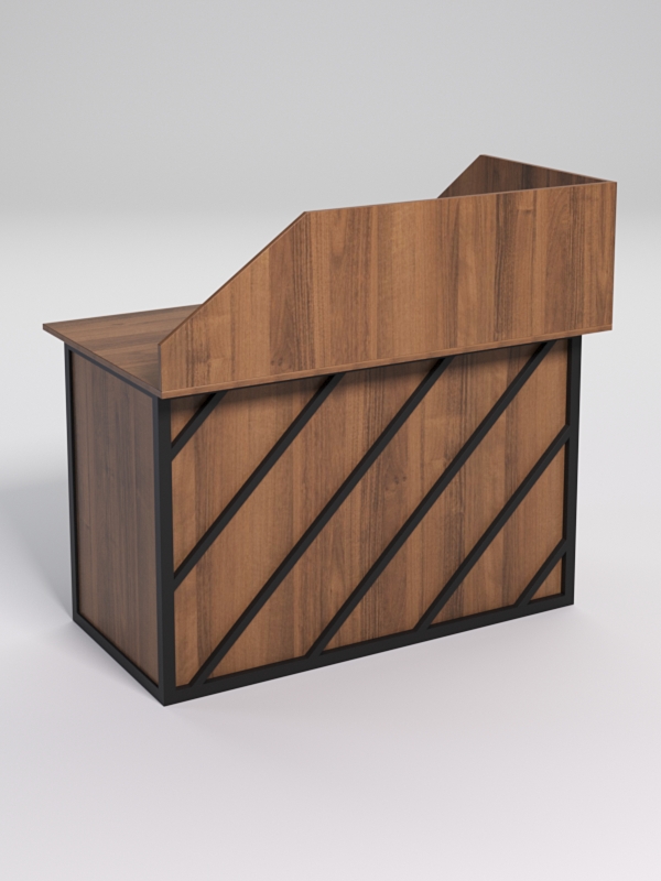 Мебель выполнена в стиле лофт. Фронтальная часть оснащена металлическими декоративными конструкциями, которые составляют оригинальный узор, по внешнему виду напоминает диагональные линии. Стиль лофт подходит для различных стилей интерьера и может быть использована как в коммерческих, так и в жилых помещениях.