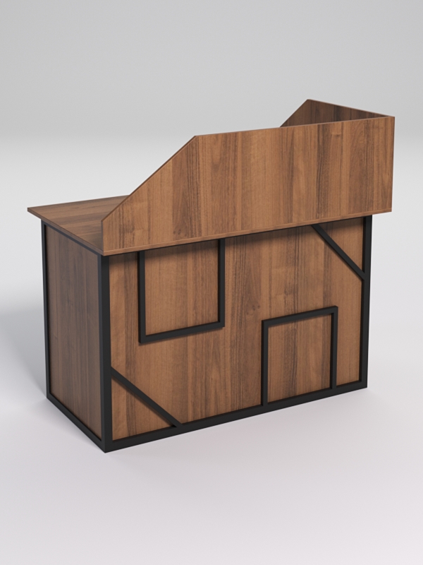 Мебель выполнена в стиле лофт. Фронтальная часть оснащена металлическими декоративными конструкциями, которые составляют оригинальный узор, напоминающий два квадрата и два треугольника. Стиль лофт подходит для различных стилей интерьера и может быть использована как в коммерческих, так и в жилых помещениях.