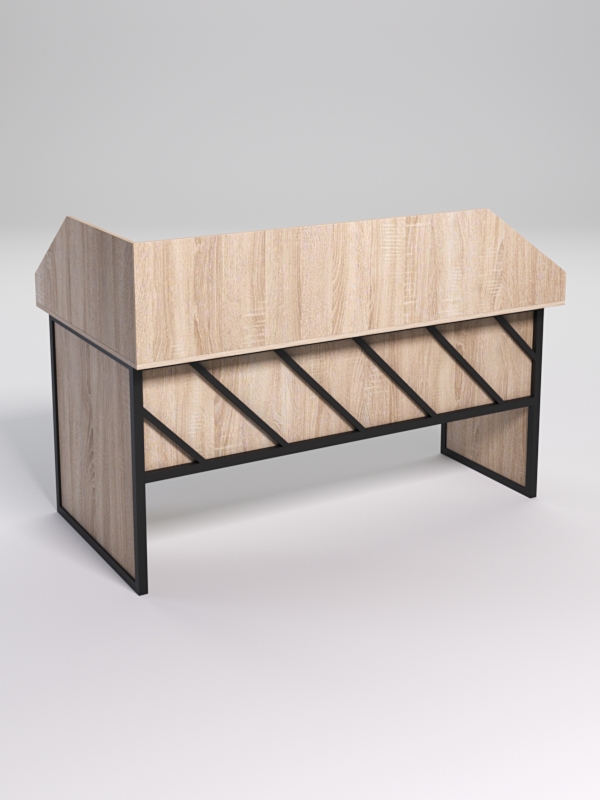 Мебель выполнена в стиле лофт. Фронтальная часть оснащена металлическими декоративными конструкциями, которые составляют оригинальный узор, который напоминает диагональные линии. Стиль лофт подходит для различных стилей интерьера и может быть использована как в коммерческих, так и в жилых помещениях.