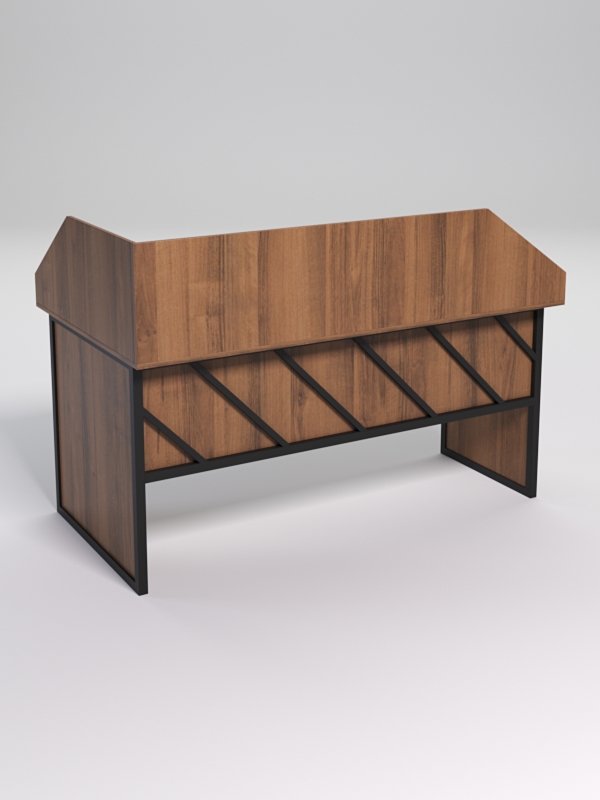 Мебель выполнена в стиле лофт. Фронтальная часть оснащена металлическими декоративными конструкциями, которые составляют оригинальный узор, который напоминает диагональные линии. Стиль лофт подходит для различных стилей интерьера и может быть использована как в коммерческих, так и в жилых помещениях.