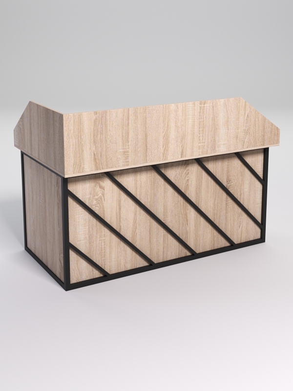 Мебель выполнена в стиле лофт. Фронтальная часть оснащена металлическими декоративными конструкциями, которые составляют оригинальный узор, который по внещнему виду напоминает диагональные линии. Стиль лофт подходит для различных стилей интерьера и может быть использована как в коммерческих, так и в жилых помещениях.