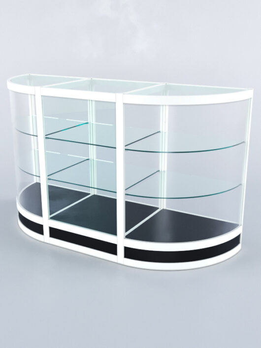 Прилавок из профиля с секторами №4 (открытый) изготавливается из алюминиевого профиля с использованием заполнителей из МДФ и стекла. Высота подиума прилавка — 15 см. Правое и левое «крыло» прилавка изготовлено из профильных дуг радиусом 50см с заполнителем МДФ и оргстекла. Прилавок комплектуется 3-мя полками. Все размеры, а также комплектация могут быть изменены по желанию заказчика. Возможно добавление полок.