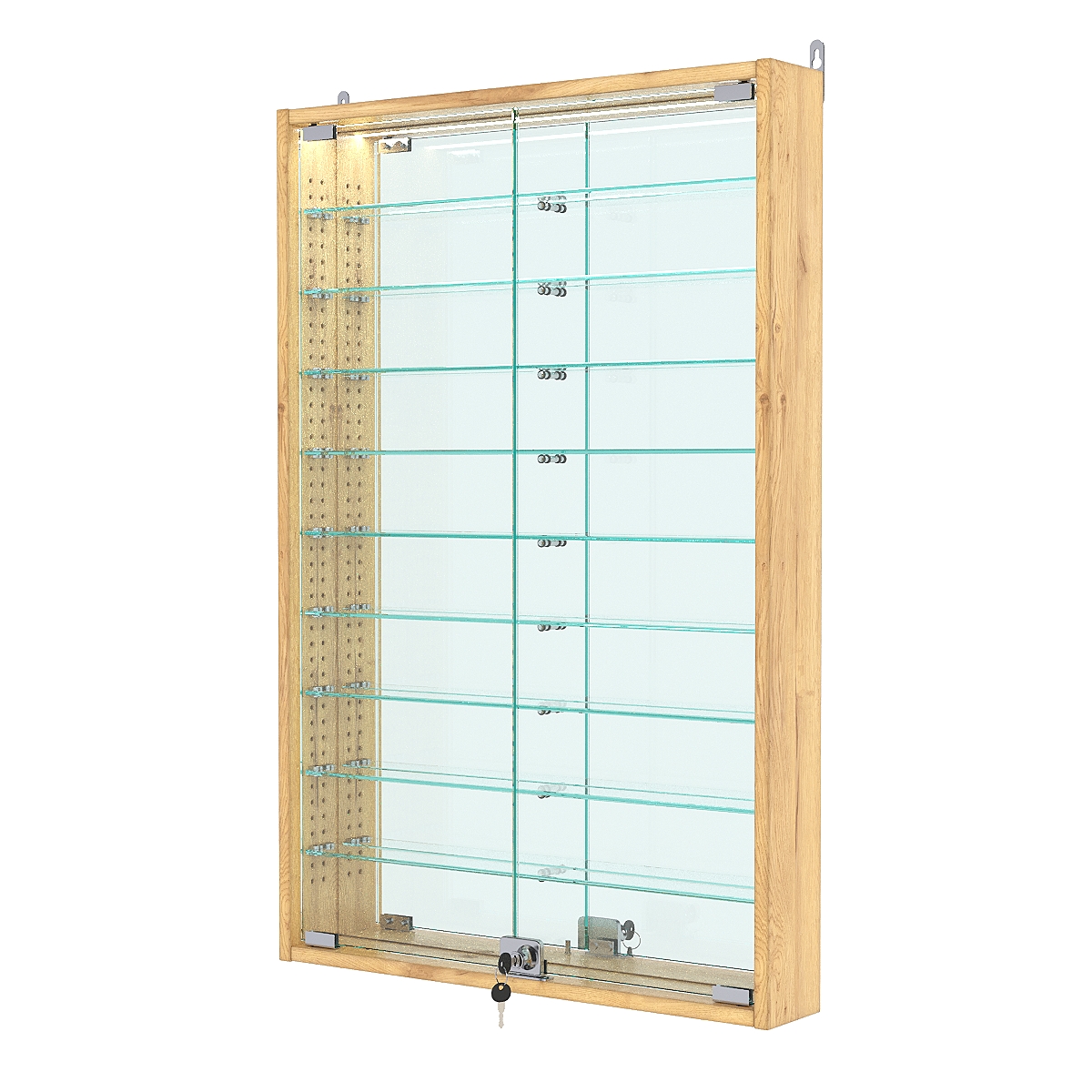 Витрины настенные представляют собой отличный вариант качественных, а главное лёгких конструкций. Собираются в течение 30 минут, монтируются на любую вертикальную поверхность. Специальных навыков при сборке не требуется. Отлично подходят для демонстрации мелких товаров, таких как: бижутерия, брелоки, модели машинок, статуэтки и прочая сувенирная продукция. Есть функция регулировки полок.