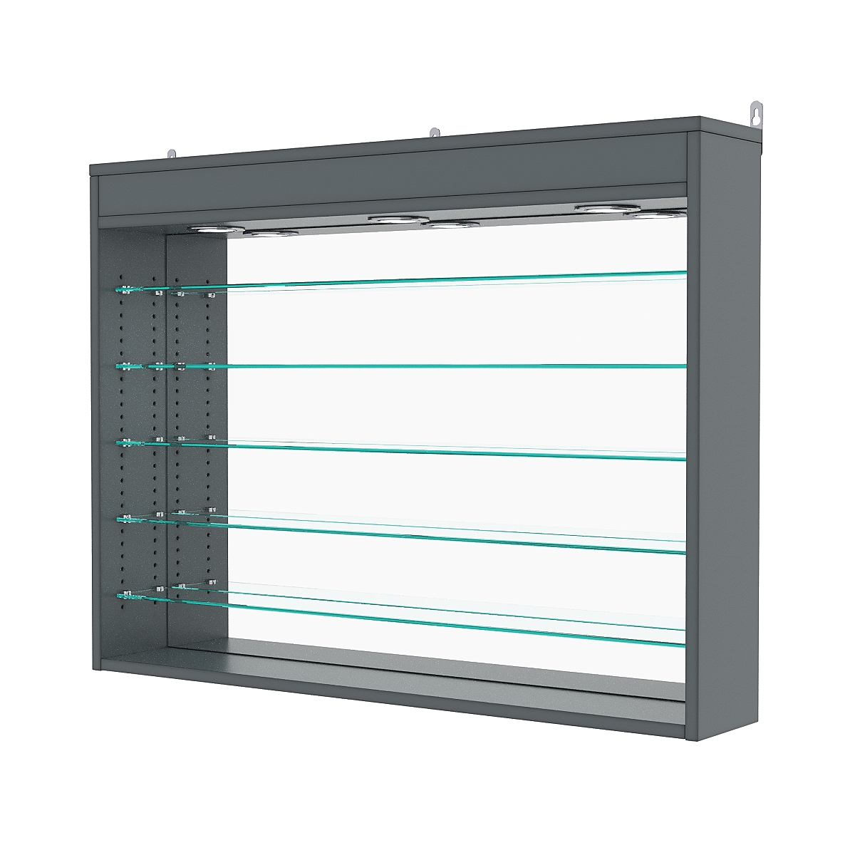 Витрины настенные представляют собой отличный вариант качественных, а главное лёгких конструкций. Собираются в течение 30 минут, монтируются на любую вертикальную поверхность. Специальных навыков при сборке не требуется. Отлично подходят для демонстрации мелких товаров, таких как: бижутерия, брелоки, модели машинок, статуэтки и прочая сувенирная продукция. Есть функция регулировки полок.