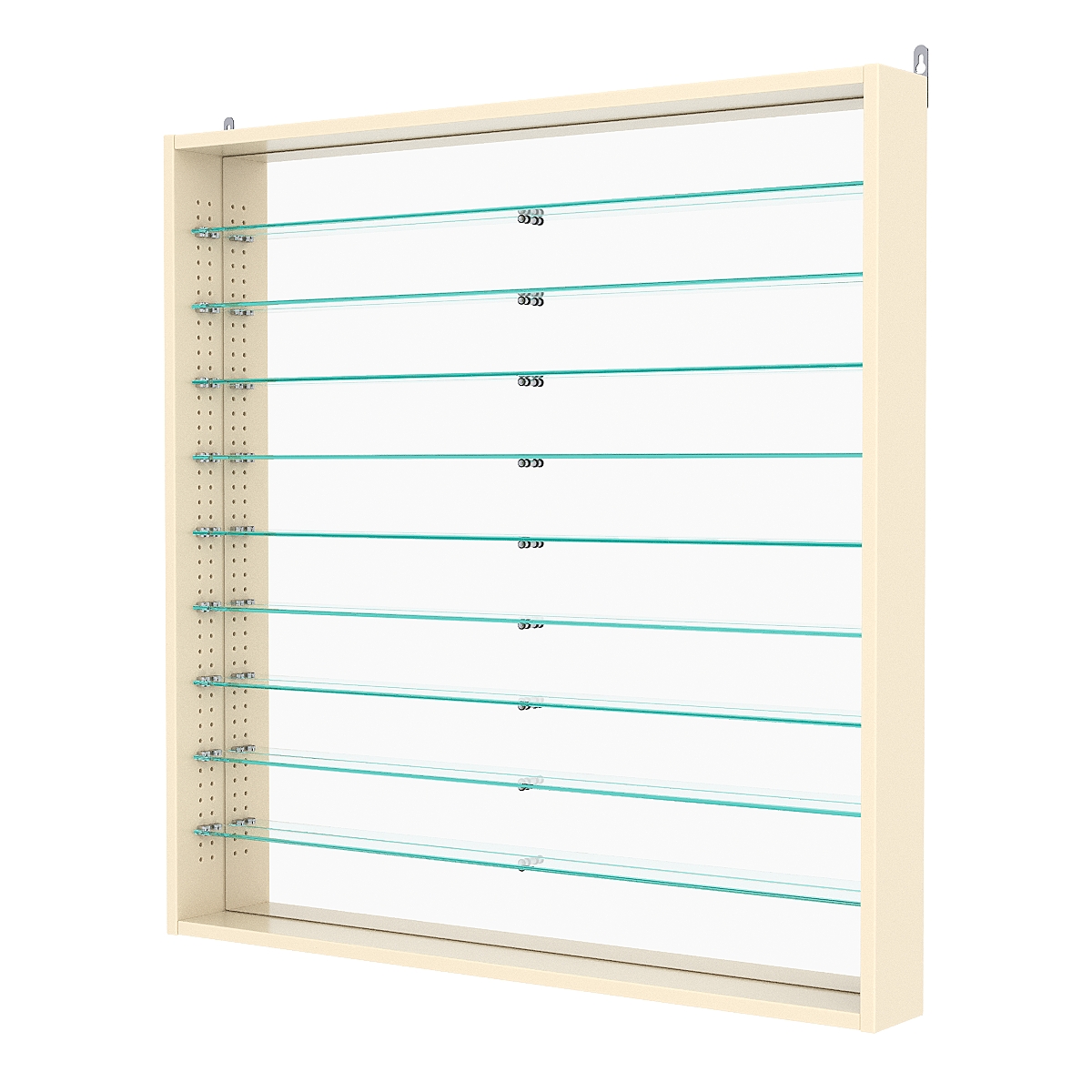 Кол-во полок из стекла 6мм: 9шт, расстояние между которыми 81мм, глубина полок 46мм;