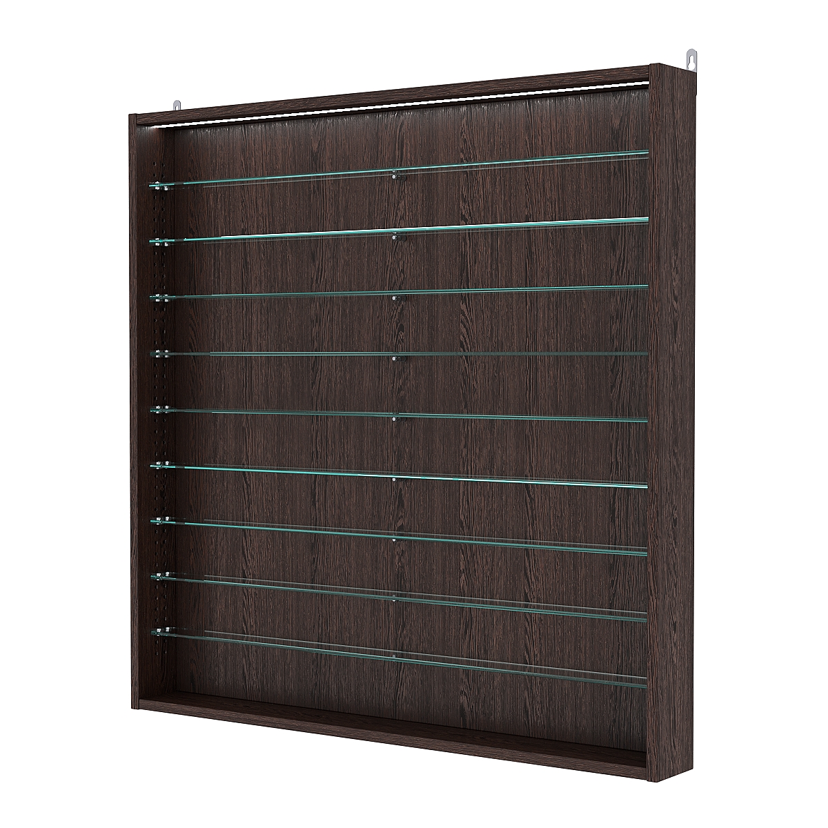 Кол-во полок из стекла 6мм: 9шт, расстояние между которыми 81мм, глубина полок 46мм;