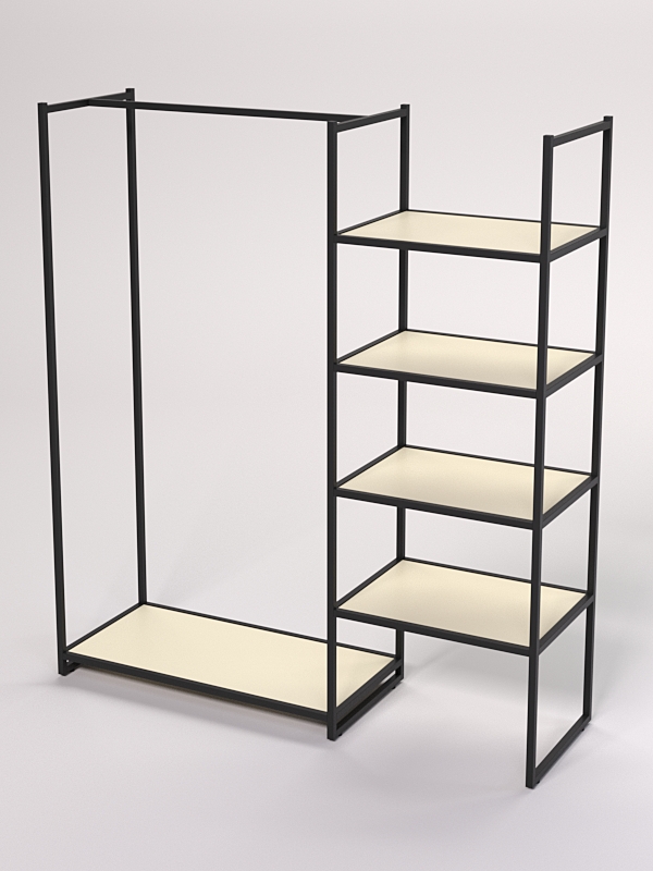 Количество стеллажей — 4, что позволяет разместить большое количество одежды и аксессуаров. На полках можно разместить товар, который необходимо продемонстрировать покупателям. Штанга для вывешивания одежды позволяет удобно и наглядно демонстрировать одежду на плечиках.