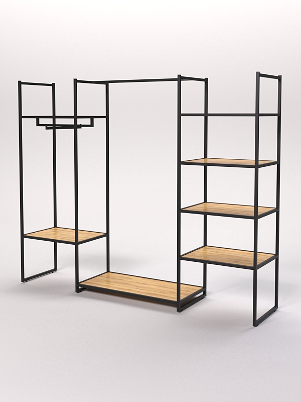 Конструкция предусматривает два вешало и пятью полками.